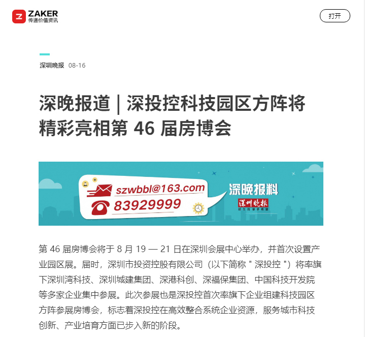 8月19日-21日,投控公司首次携旗下深圳湾科技、城建集团、深港科创、深福保集团、中开院等科技园区板块企业集体亮相“中国地产第一展”,展现了投控系统科技园区强大的创新资源集聚能力和科技产业培育能力,引起了媒体的广泛关注。人民网、光明日报、经济日报、南方日报、深圳特区报等众多主流媒体都对此作出详尽报道。