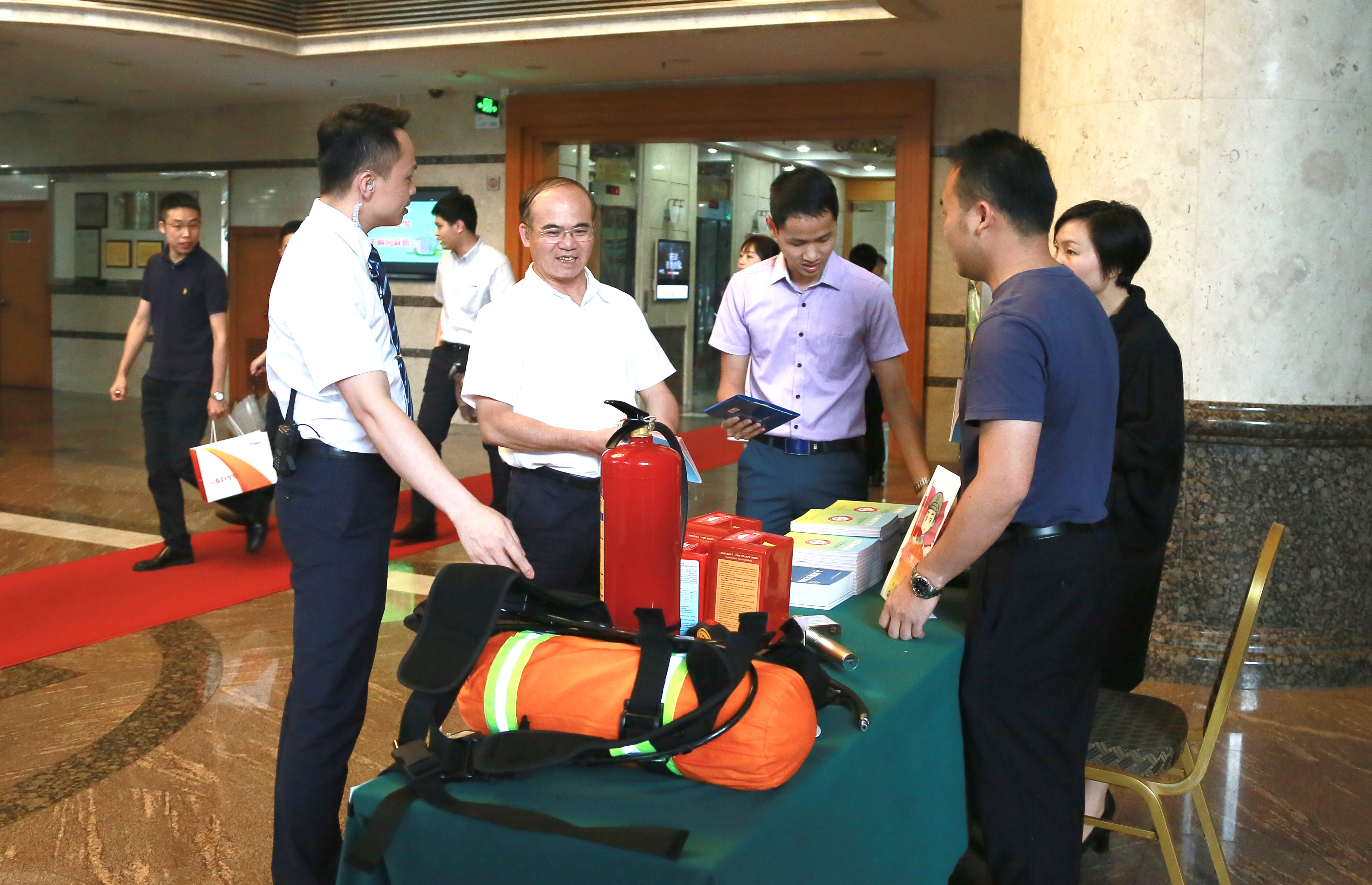 在活动现场,彭海斌主任和麦振新副书记仔细查看现场分发的安全宣传资料和摆放的消防安全器材,并认真询问投资大厦在安全生产月期间开展的系列活动。