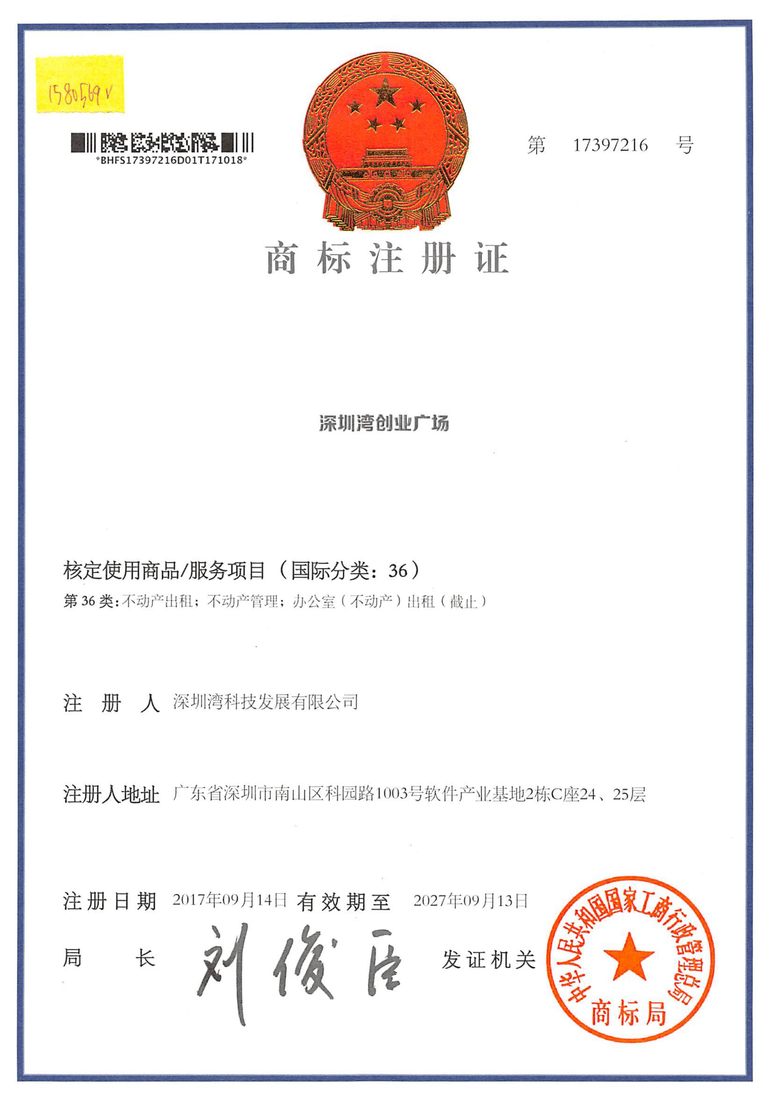 11月6日,深圳湾公司收到国家工商行政管理总局商标局颁发的“深圳湾创业广场”商标注册证书,成功获取第一个注册商标。