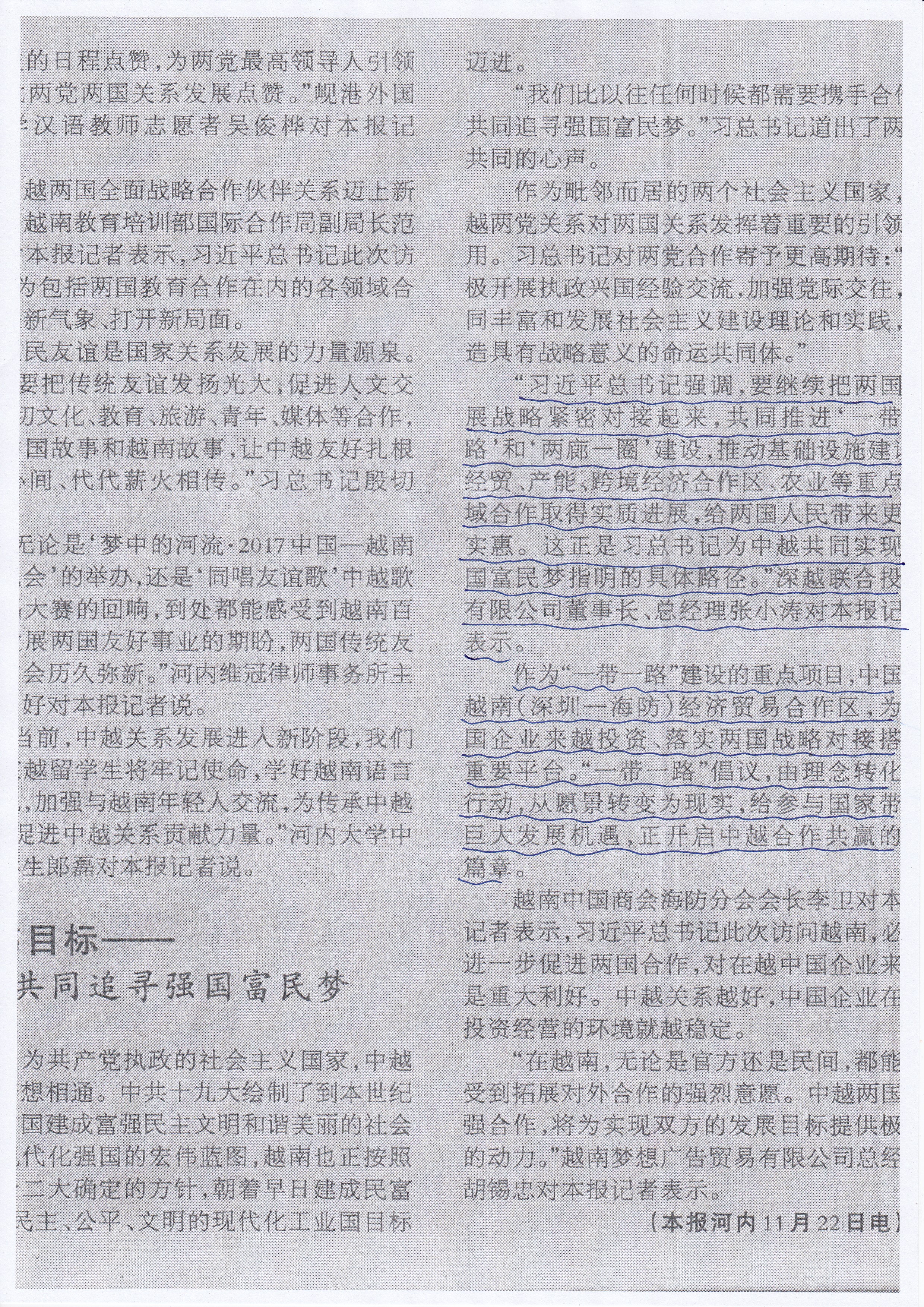 “习近平总书记强调,要继续把两国发展战略紧密对接起来,共同推进‘一带一路’和‘两廊一圈’建设,推动基础设施建设、经贸、产能、跨境经济合作区、农业等重点领域合作取得实质进展,给两国人民带来更多实惠。这正是习总书记为中越共同实现强国富民梦指明的具体路径。”深越联合投资有限公司董事长、总经理张小涛对本报记者表示。